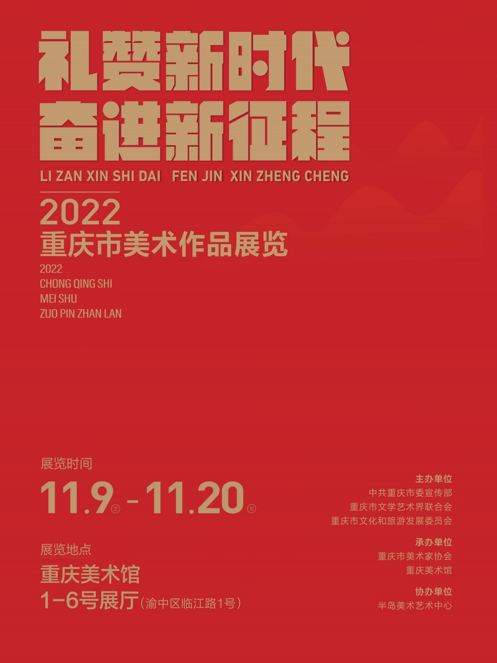 展览时间 2022年11月9日—11月20日 展览地点 重庆美术馆1-6号厅 主办单位 中共重庆市委宣传部 重庆市文学艺术界联合会 重庆市文化和旅游发展委员会 承办单位 重庆市美术家协会 重庆美术馆 协办单位 半岛美术艺术中心 前 言 新时代成就伟业,新征程催人奋进。为深入学习宣传贯彻党的二十大精神,中共重庆市委宣传部、重庆市文学艺术界联合会、重庆市文化和旅游发展委员会、重庆市美术家协会决定共同举办“礼赞新时代、奋进新征程——2022重庆市美术作品展览”。